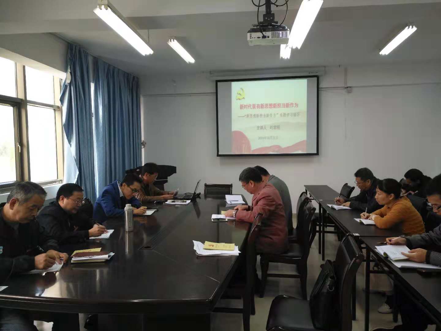 2018年10月31日上午,学院机关党总支在行政楼五楼会议室召开“新思想、新担当、新作为”专题党课学习会。学院机关党总支叶常明书记作“新思想、新担当、新作为”专题党课学习辅导,通过专题党课学习,使机关全体党员充分认识了“新思想、新担当、新作为”的精神实质和丰富内涵,与会党员表示要以习近平新时代中国特色社会主义思想武装头脑、指导实践,要切实增强“四力”,大力弘扬“四种精神”,听党话跟党走。机关党总支还对“新思想、新担当、新作为”专题后续阶段交流讨论工作作出部署。