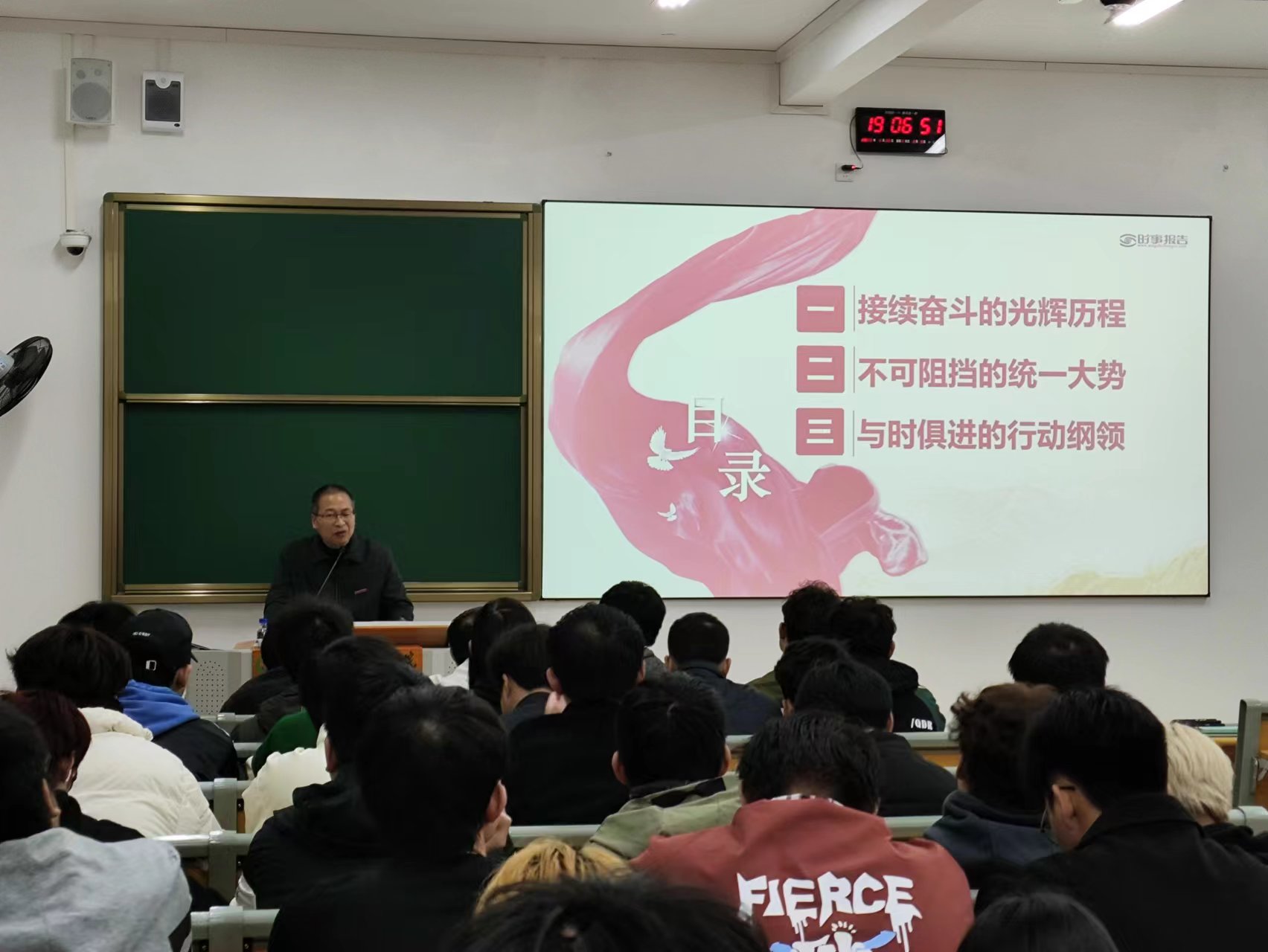 课堂上,郑需勇通过详实的史料、平实的语言、生动的事例紧紧围绕“接续奋斗的光辉历程”、“不可阻挡的统一大势”、“与时俱进的行动纲领”等三个方面对两岸关系的昨天、今天和明天进行了总结和展望,深刻阐释台海形势的时与势,坚定共创祖国统一、民族复兴伟业的信心和决心。勉励同学们坚定理想信念,励志发奋图强,练就过硬本领,自觉将小我融入大我,将个人奋斗融入国家事业,为中华民族伟大复兴的中国梦贡献青春力量。