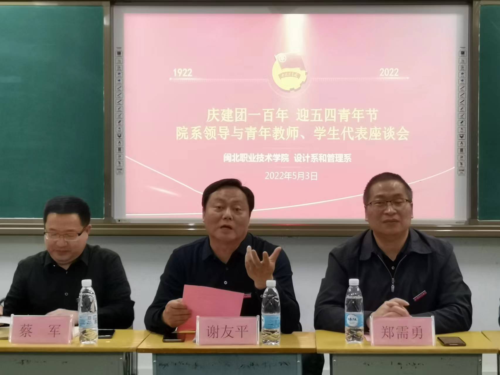 5月3日晚,设计系和管理系第二党支部、团总支组织召开“庆建团一百年 迎五四青年节”青年师生代表座谈会。院党委书记谢友平,院党委委员、副院长郑需勇,院党委委员、组织统战部长蔡军等院党委领导;院学生工作处刘林处长;设计系和管理系联合党总支书记傅晋飞等系部领导,同师生代表四十余人,共聚一堂。