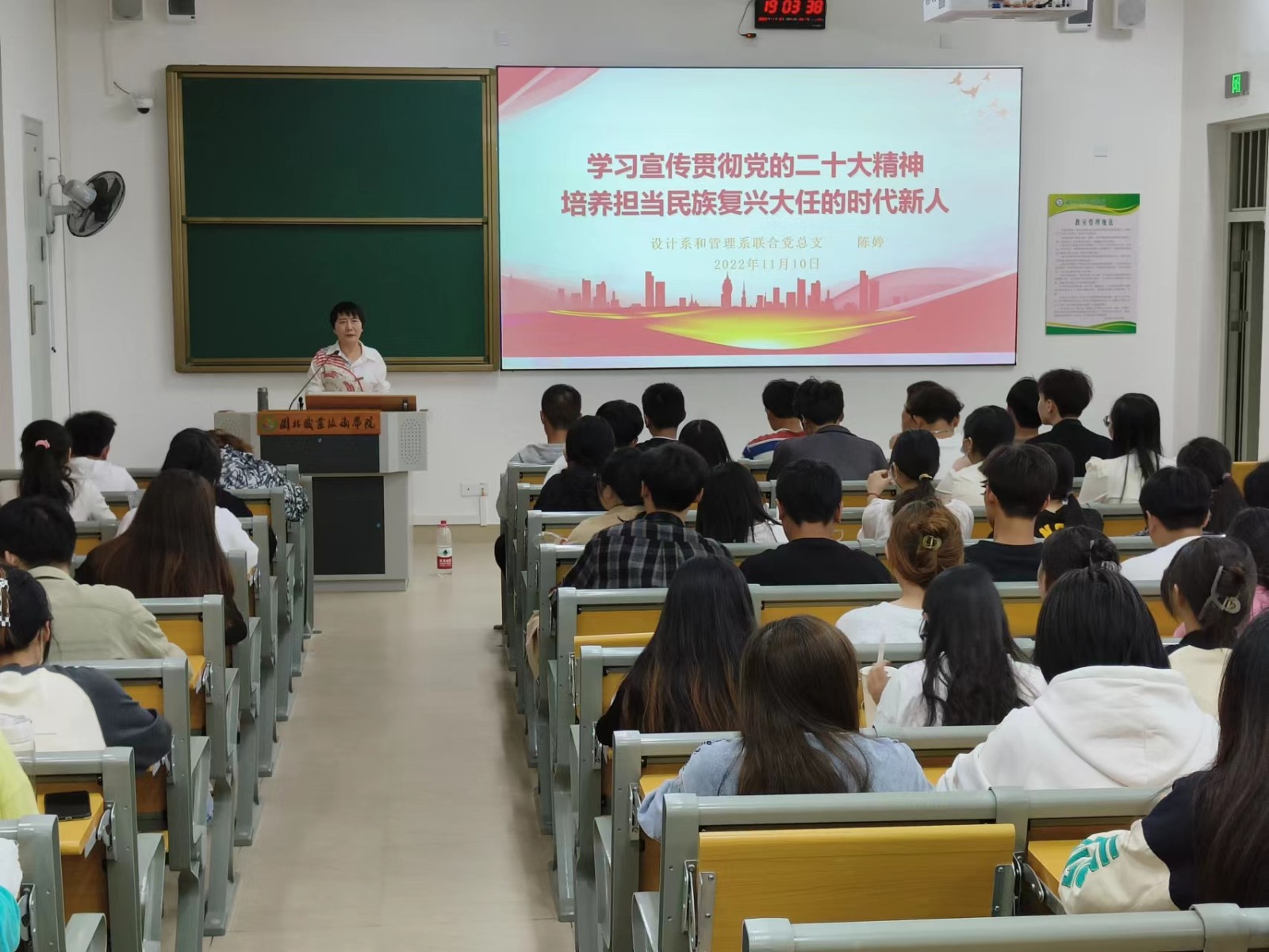 根据院党委关于开展学习贯彻党的二十大精神宣讲工作部署,11月10日晚,设计系和管理系联合党总支组织开展学习贯彻党的二十大精神首场宣讲,在6号教学楼200人报告厅、302阶梯教室、303阶梯教室同时进行,由院系宣讲团成员设计系和管理系联合党总支书记傅晋飞、设计系兼管理系主任陈婷、系第一党支部书记兼设计系教科办主任赖莉琼以《学习宣传贯彻党的二十大精神,培养担当民族复兴大任的时代新人》为题开展宣讲,2021级近500名学生聆听了报告。