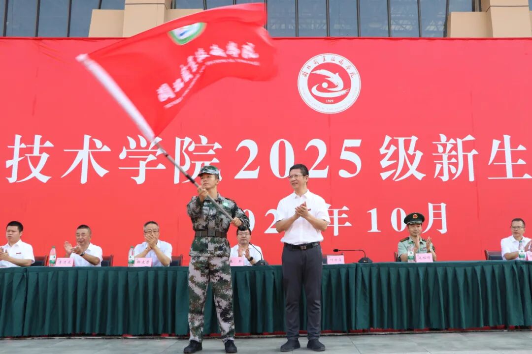 叶世森授旗并宣布2025级新生军训开训。旗帜挥舞,使命在肩,为期两周的军训正式拉开帷幕。