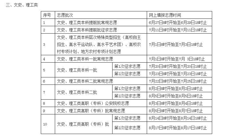 今年文史、理工类设本科提前批、本科一批、本科二批和高职(专科)批四个批次;艺术类设本科提前批、本科A批、本科B批和高职(专科)批四个批次;体育类设本科批和高职(专科)批两个批次。