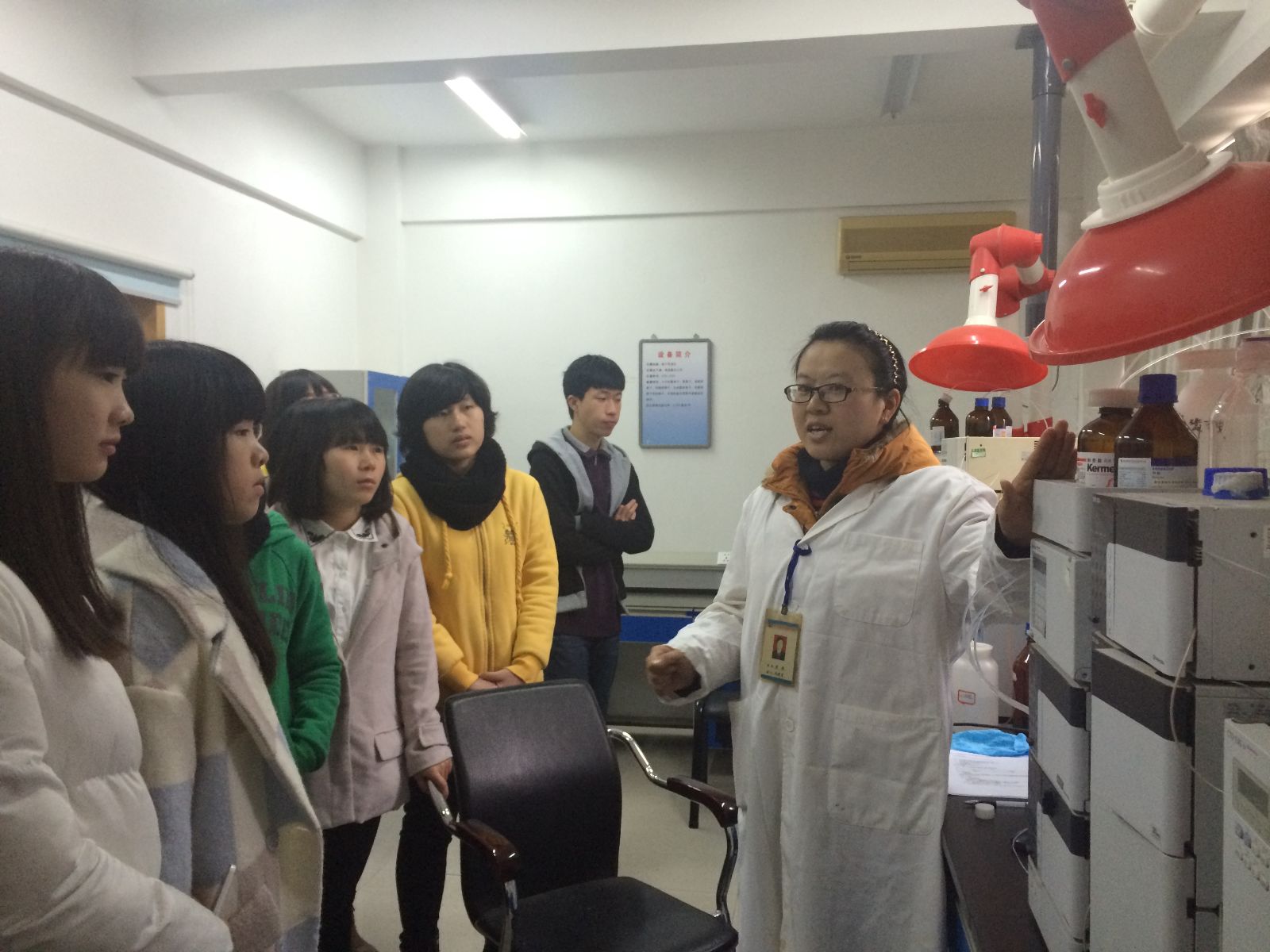 在质检所实验室主任及相关人员带领下,同学们先后参观了理化实验室、纯水制备室、气相色谱分析室等多个实验室,在实验人员的介绍下,同学们一一了解原子荧光分光光度计、液相色谱仪、气相色谱仪、原子吸收分光光度计等相关检测设备工作原理,让同学们亲临食品检验第一线,从而了解食品安全的重要性。在简短的参观学习后,化验室陈锋主任与同学们进行悉心交谈,指出目前食品行业面临的机遇与挑战,鼓励大家认真学习。