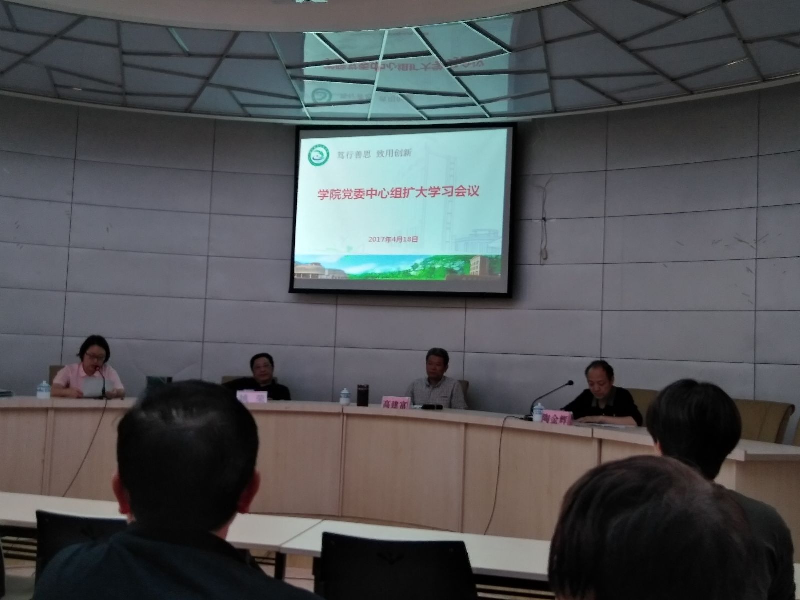4月18日下午,我院在办公楼一楼报告厅召开了“学院党委中心组扩大学习会议”,会议内容为学习廖俊波同志先进事迹,会议由党委副书记陶金辉主持,学院各处室及各系部负责人、党总支负责人参加了会议,我系张金良主任、郑启阶副书记参加了会议。