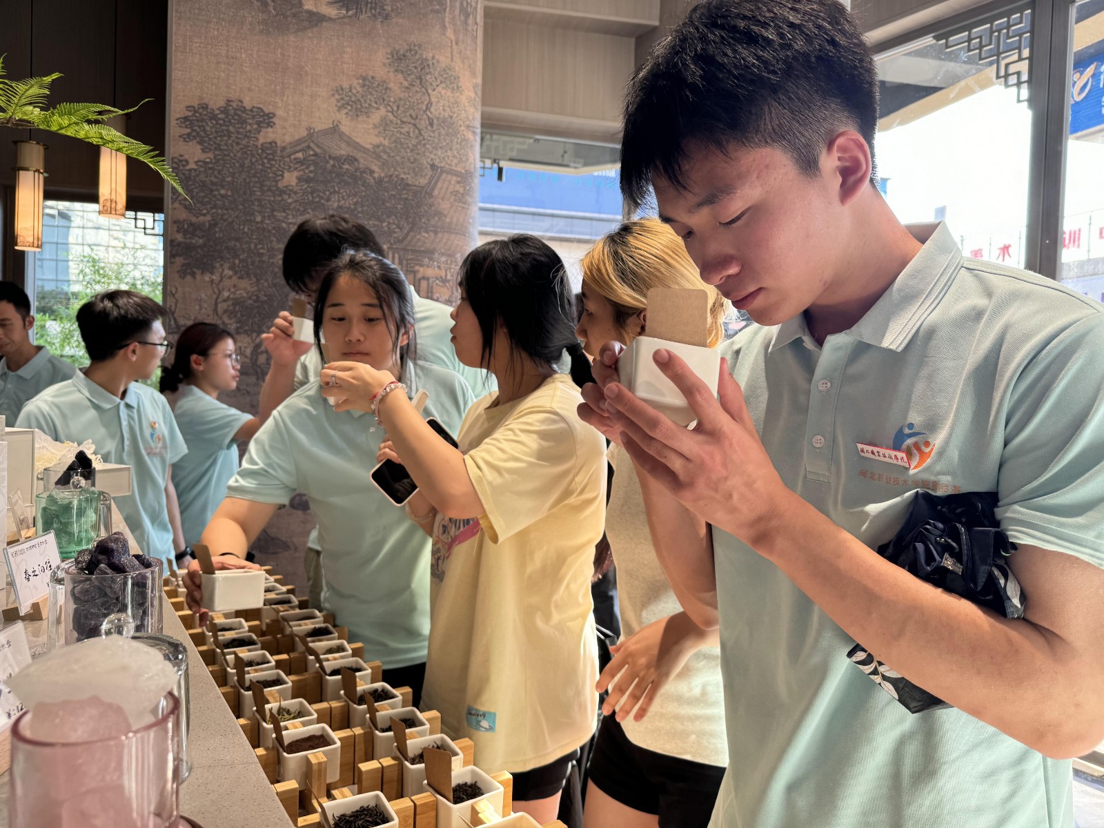 随后,实践队走访了建瓯市大学生就业创业服务站及宋初茶竹空间体验馆。在馆内,队员们深入了解了中国茶文化的历史脉络与发展轨迹,同时欣赏了众多融合传统工艺与现代创意的茶竹文创产品,这些产品不仅展现了传统与现代的和谐共生,更促进了当地村民的就业与增收,激发了他们的创新活力。馆内设置的互动区域使同学们在轻松愉悦的氛围中学习泡茶技巧,这种寓教于乐的方式使茶文化更加生动有趣,也使同学们在游玩中获得了宝贵的收获。