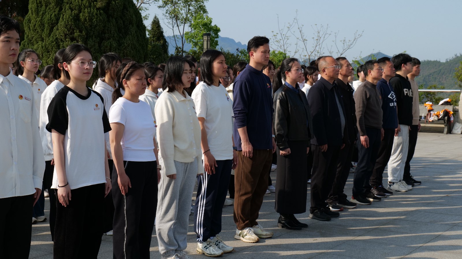 下午4点,全体师生整齐列队,步行至九峰山革命烈士纪念碑前肃立。校党委副书记蔡军主持仪式并宣布活动开始。在庄严的国歌声中,全体人员向革命烈士致以深切哀思。随后,学生代表向烈士纪念碑敬献鲜花,全体师生行三鞠躬礼,表达对先烈们的崇高敬意。