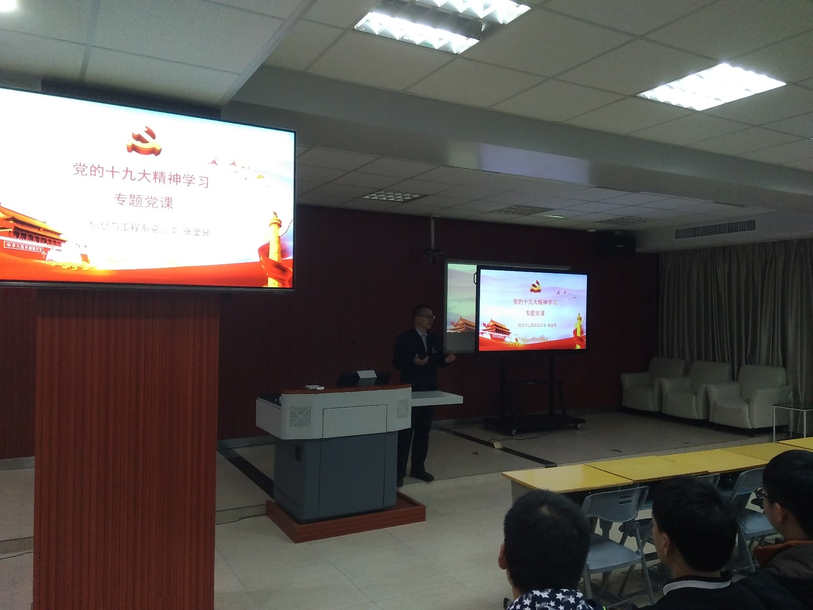 2017年12月11日晚,系主任、副书记张金良为我系2017级全体学生上了一堂生动的学习党的十九大精神专题党课。他对十九大后修改通过的党章进行了讲解,重点对“党的组织制度”、“党的基层组织”、“党的纪律”等进行了详细讲解;勉励广大同学要志存高远,要有坚定的理想信念,在学习、生活中要脚踏实地,始终要有昂扬的斗志和积极向上的精神,希望同学们早日加入党组织,成为一名合格的中共党员。
