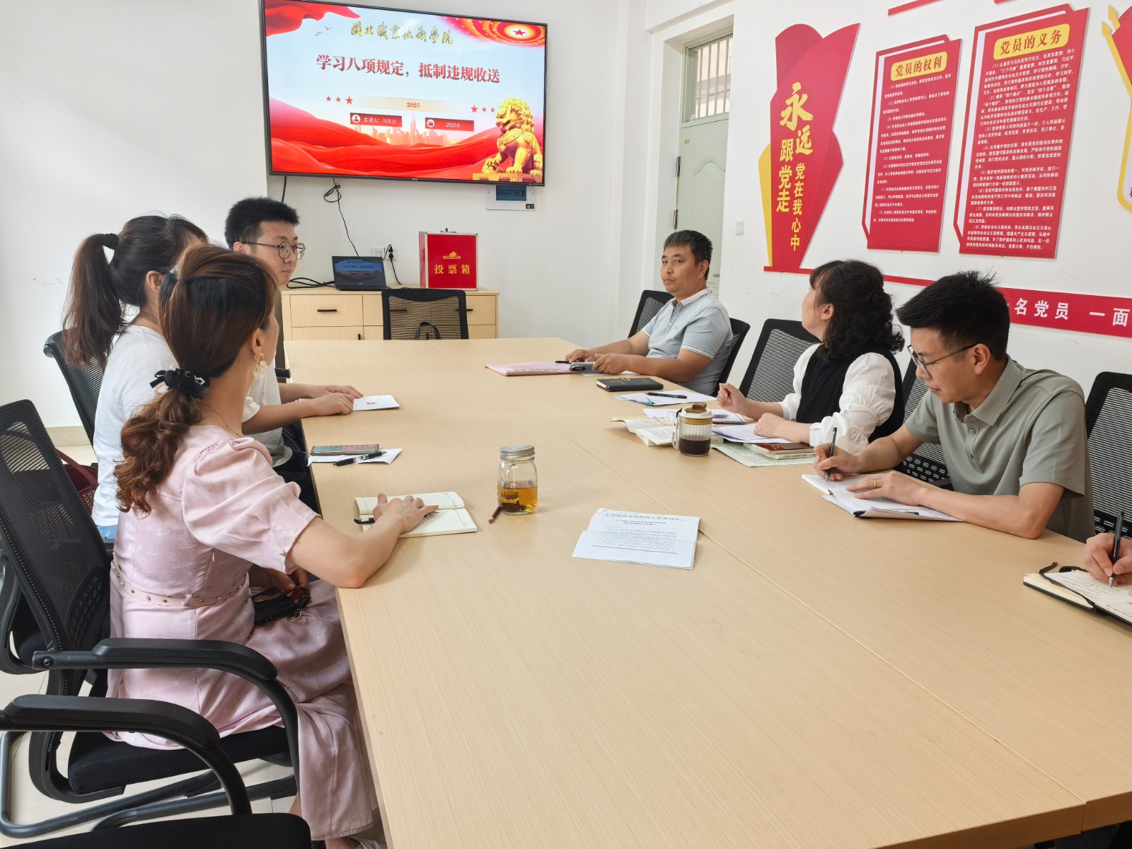 2025年6月4日,信息系第二党支部在3号教学楼407会议室组织开展“学习八项规定精神,抵制违规收送”专题党课学习。此次党课由党支部纪检委员刘彦会同志主讲,支部全体党员参与。