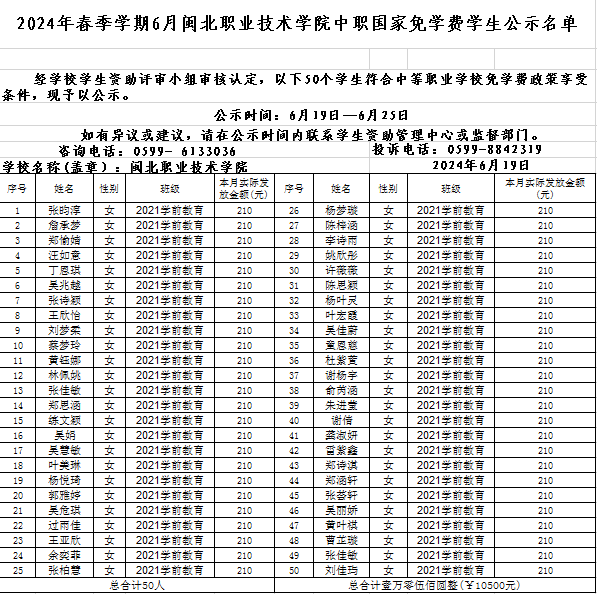 2024年春季学期6月8040威尼斯中职国家免学费学生公示名单
