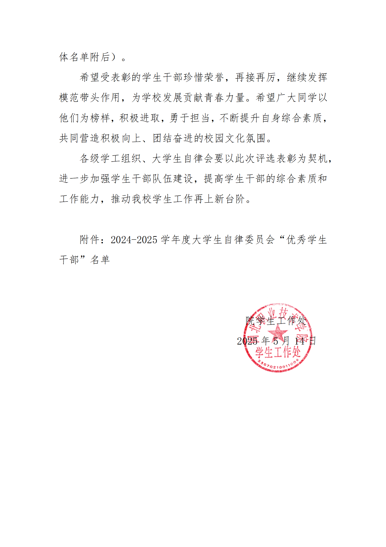关于表彰2024-2025学年度大学生自律委员会“优秀学生干部”的决定