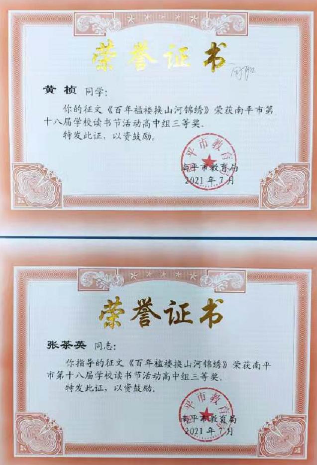 学院师生获南平市大中小学生“喜迎建党100周年”系列活动暨第十八届学校读书节活动高中组征文一、三等奖