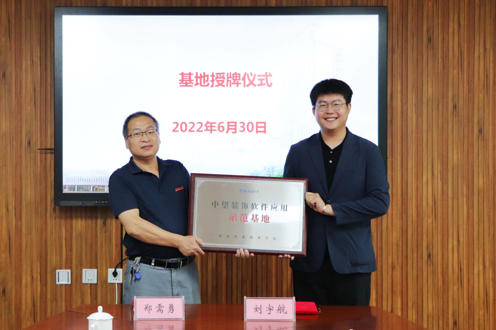 随后郑需勇副院长和刘宇航总监签订了校企合作的框架协议及“中望装饰软件应用示范基地”的授牌仪式。