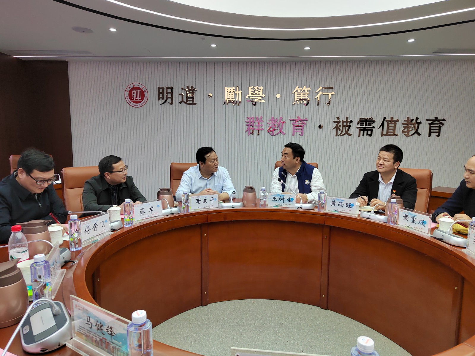谢书记一行在泉州轻工职业学院执行董事王树生带领下参观了校园环境、实训室建设,并开展了交流,双方重点交流了办学理念、办学定位、人才培养模式、校企合作模式等内容。谢友平书记高度评价了泉州轻工职业学院“群教育、被需值”的教育理念,认为“三有”(目中有人、心中有情、手中有爱)“三动”(动手、动脑、动口)“四会”(会学习、会交往、会生活、会工作)的人才培养目标的提炼符合人才培养规律。王树生董事长认为双方学校在专业建设、实训室建设、校企合作等方面各有优势,应进一步加强合作,做到优势互补。通过深入开放交流,最后双方在加强山海合作等,达成初步意向。