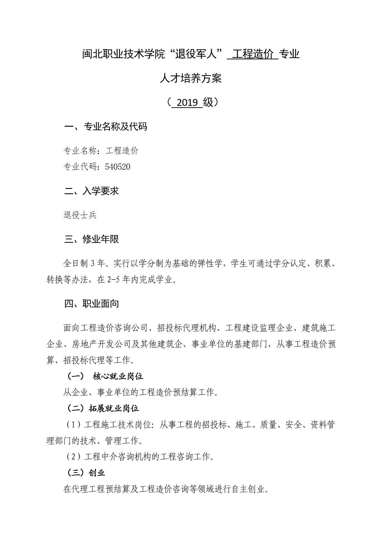 2019级“退役军人”工程造价专业人才培养方案